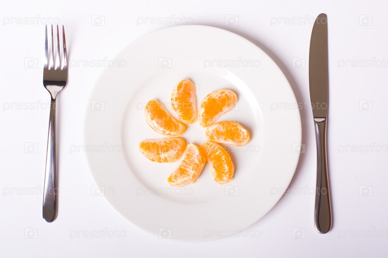 Мандарины на белой тарелке с вилкой и ножом