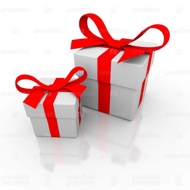 Трехмерное изображение подарков с красной лентой на белом фоне