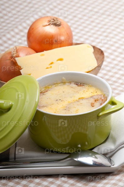 Луковый суп с сыром и хлебом
