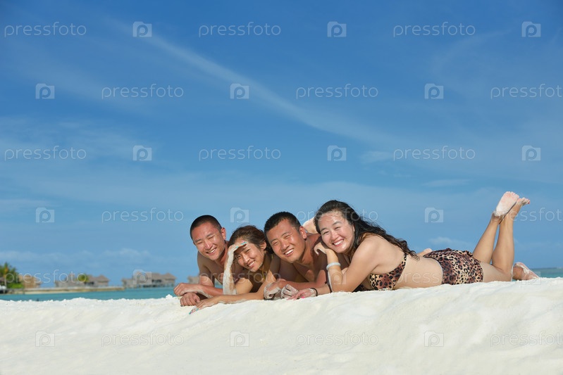 Группа счастливых молодых людей веселится на пляже