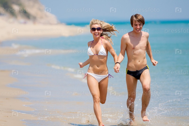 Молодая пара, бегущая по океанскому берегу