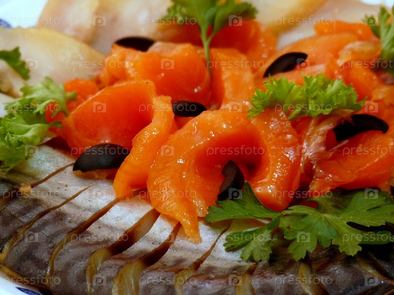 Рыбное ассорти из селедки и семги, украшенное зеленью и оливками