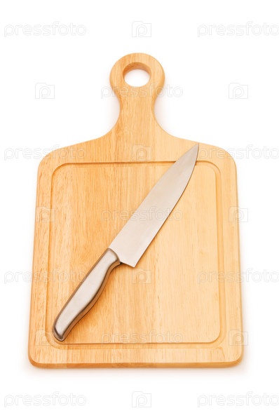 Острый нож на разделочной доске на белом фоне