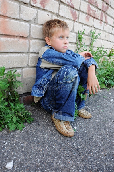 Маленький мальчик, сидящий на корточках у кирпичной стены