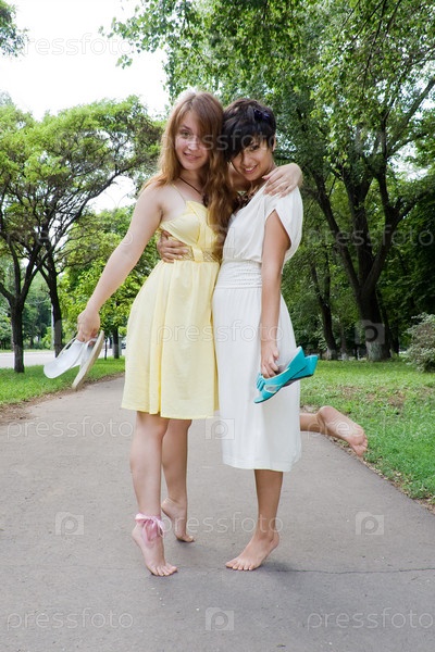 Две молодые босые девушки в парке
