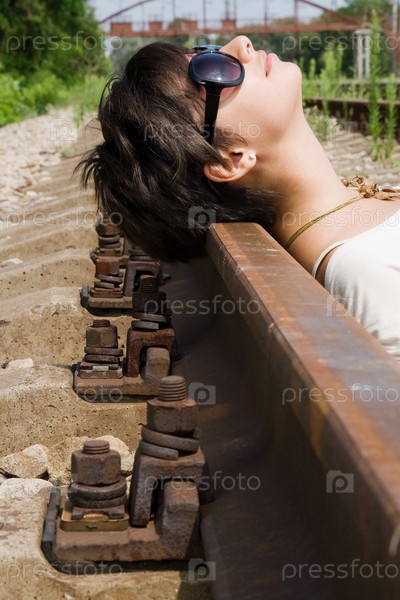 Молодая девушка на железнодорожных путях