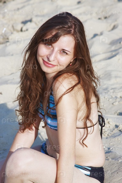 Брюнетка в голубом купальнике на песчаном пляже