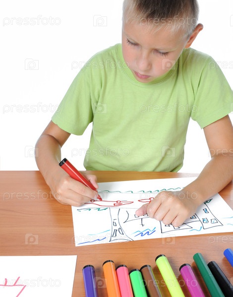 Школьник рисует на бумаге фломастером