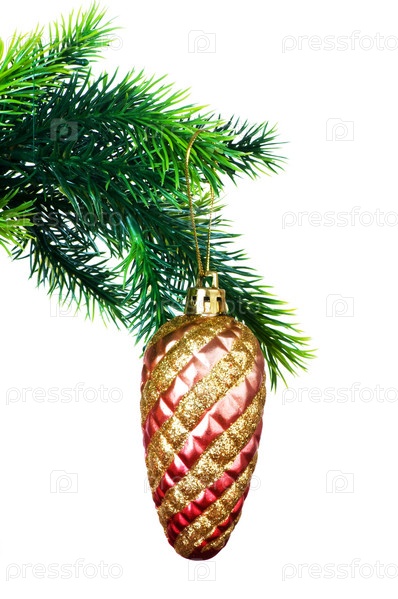 Новогодняя шишка на ветке на белом фоне