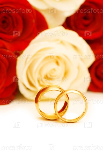 Два обручальных кольца на фоне букета роз крупным планом