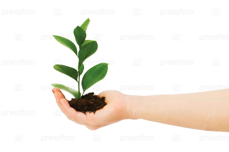 Зеленый саженец в руке изолированный на белом