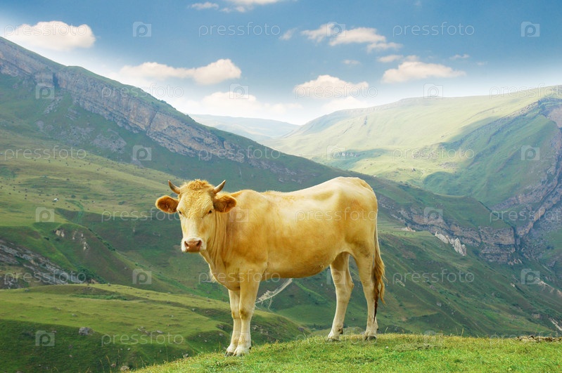 Желтая корова на фоне гор