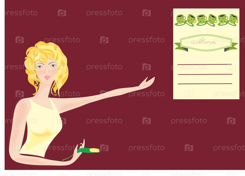 Голубоглазая нарисованная блондинка. Девушка указывает рукой на текст - меню
