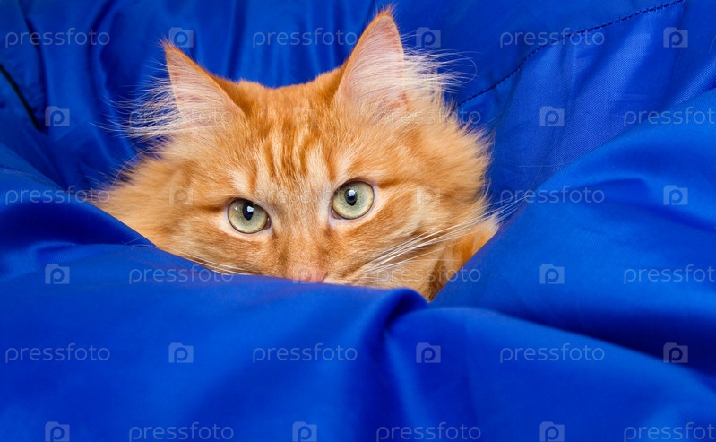 Рыжая кошка прячется в синем одеяле