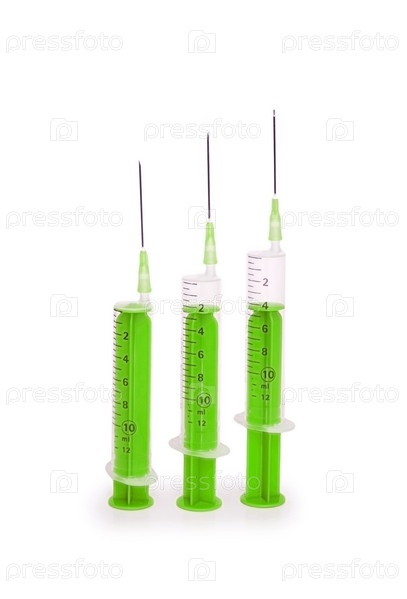 Зеленые шприцы с иголками на белом фоне
