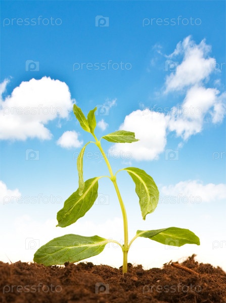 Зеленый росток в земле на фоне неба