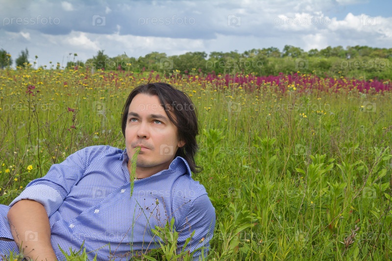 Мужчина лежит на весеннем лугу