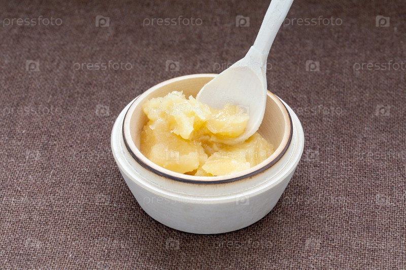 Горшок меда и деревянный ковш на ткани