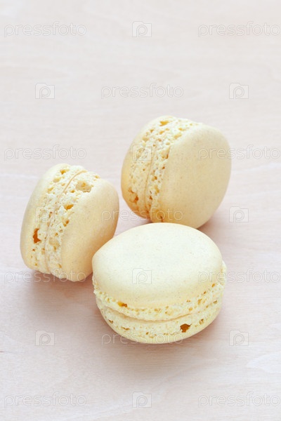 Желтые печенья макарон на деревянном фоне