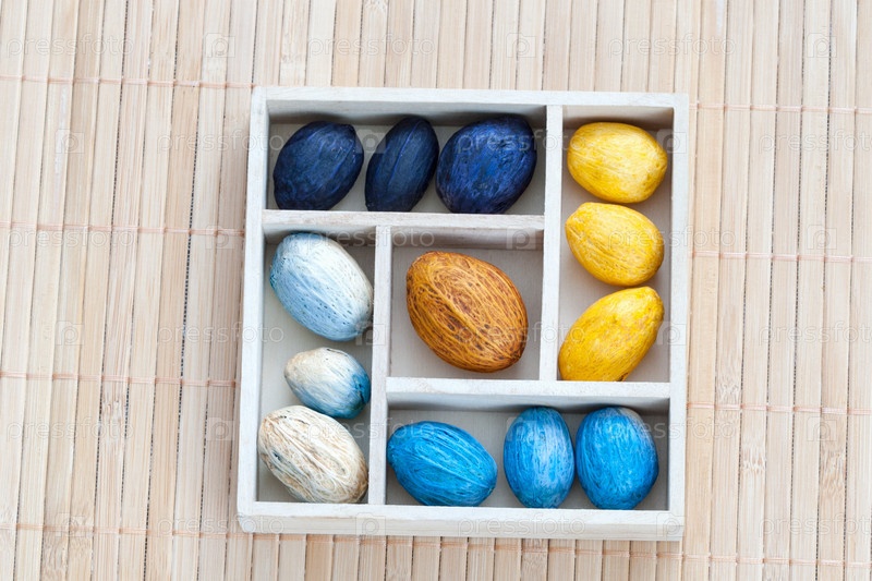 Коробка с цветными орехами на бамбуковой салфетке