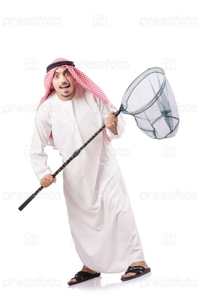 Араб с сачком на белом фоне