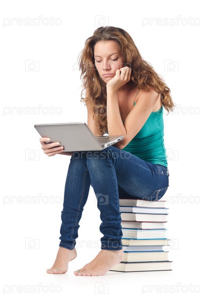 Студентка с нетбуком сидит на книгах
