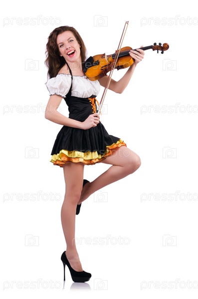Молодая женщина играет на скрипке на белом фоне