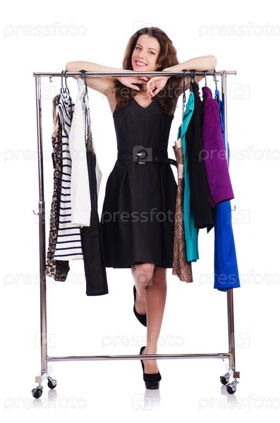 Женщина меряет новую одежду на белом