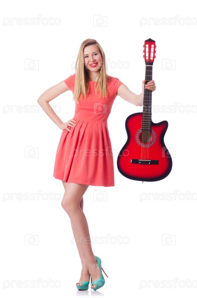 Женщина играет на гитаре, изолированная на белом