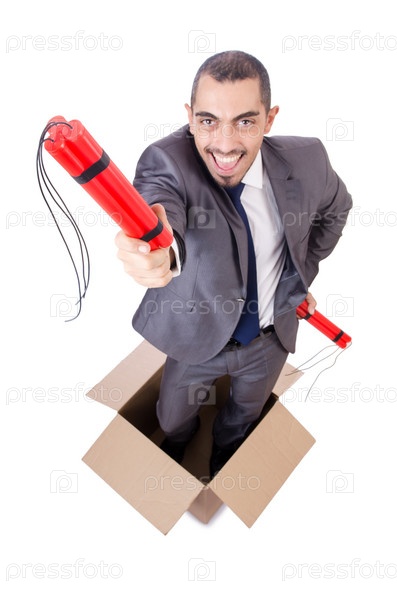 Бизнесмен с динамитом, изолированный на белом