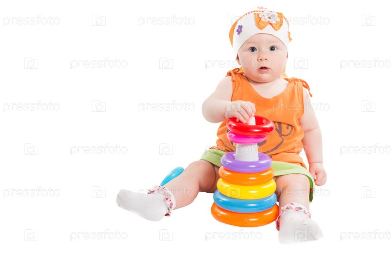Девочка играет с игрушечной пирамидой, изолированная на белом фоне. Игрушка для детей