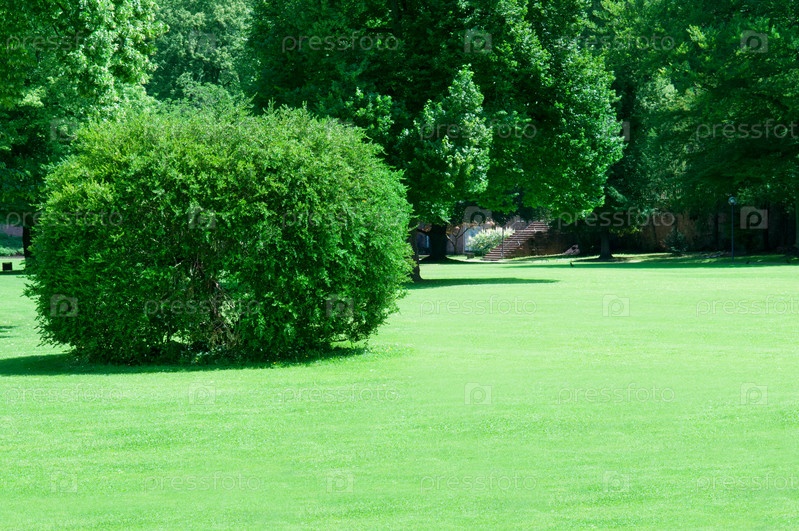 Летний парк с красивыми зелеными газонами