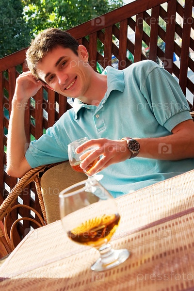 Молодой человек сидит за столиком в летнем кафе