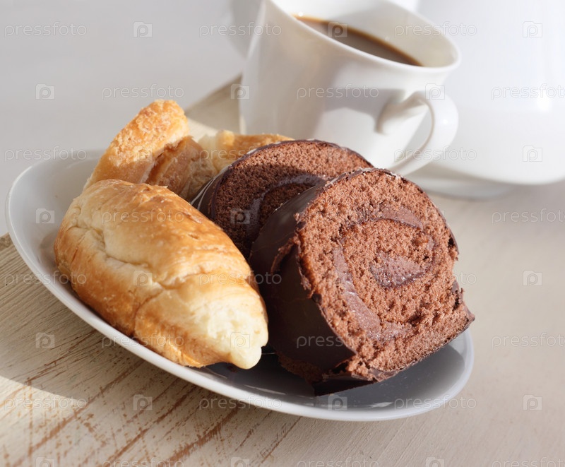На состаренной, выбеленной доске стоит чашка кофе, бисквит и рогалик в блюдце