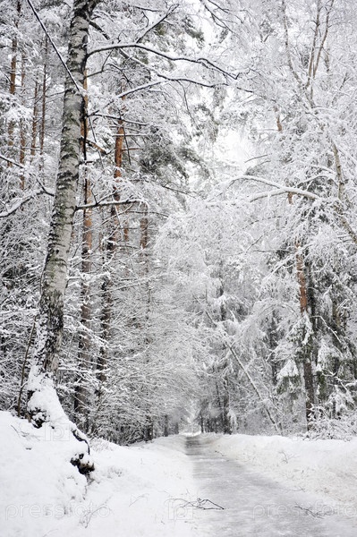 Зимняя дорога в снежном лесу