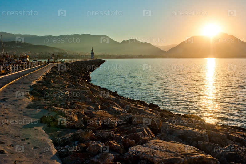 Пейзаж с маяком в гавани города Алания на рассвете
