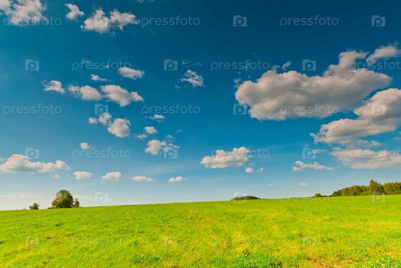 Прекрасный вид зеленого поля и голубого неба с облаками