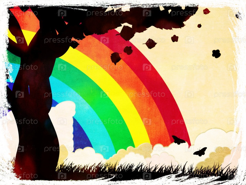 Гранжеый фон с силуэтом дерева и радугой