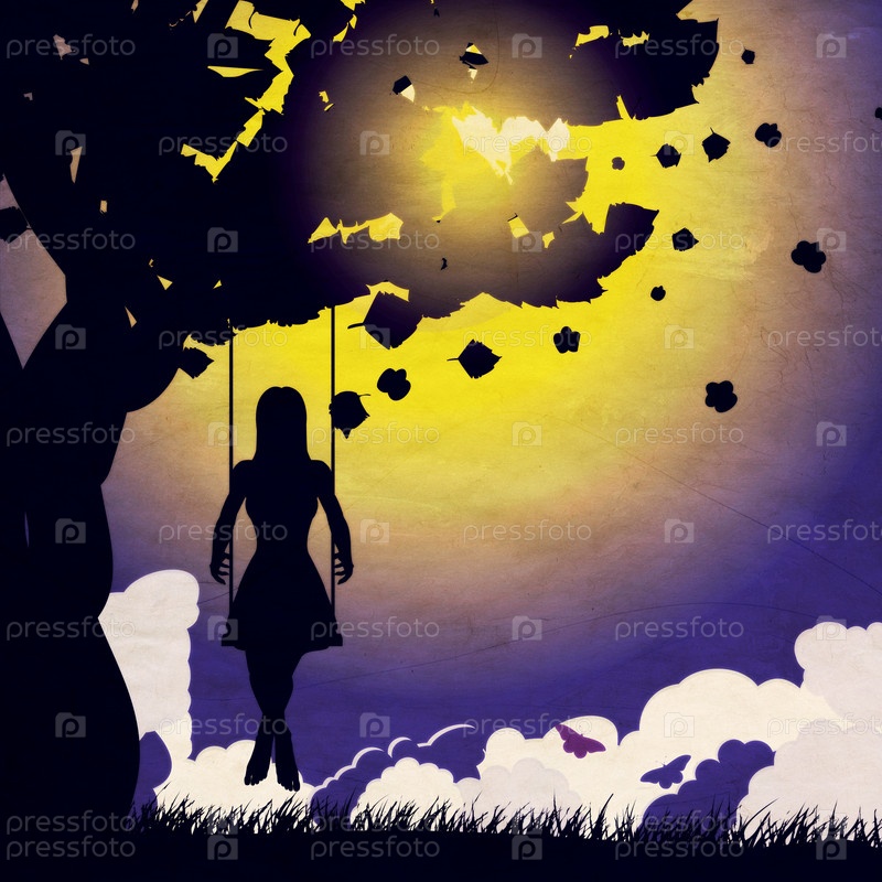 Гранжевый фон с силуэтом девушки на качели ночью
