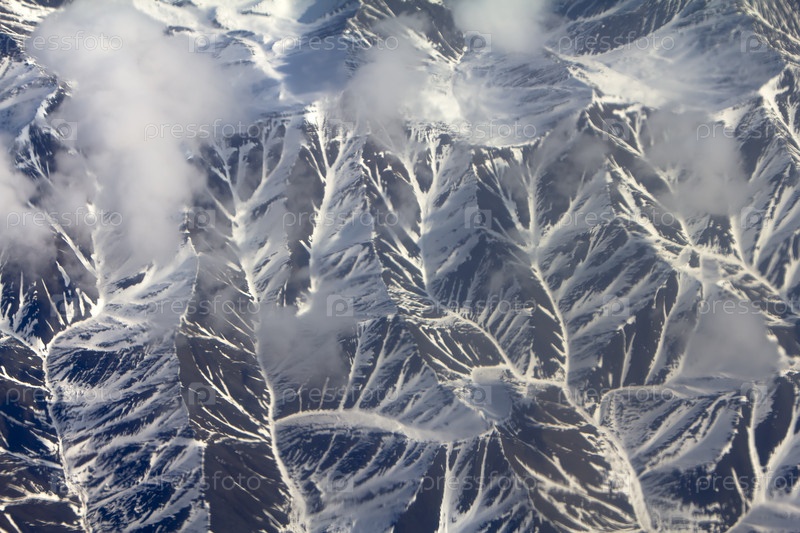 Снежный узор, облака и камни: вид с высоты