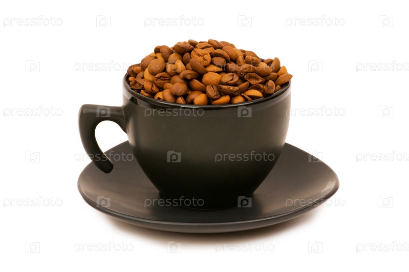 Черная кружка с кофейными зернами на белом фоне