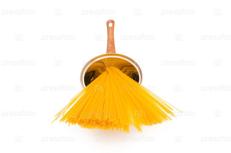 Спагетти в кастрюле на белом фоне