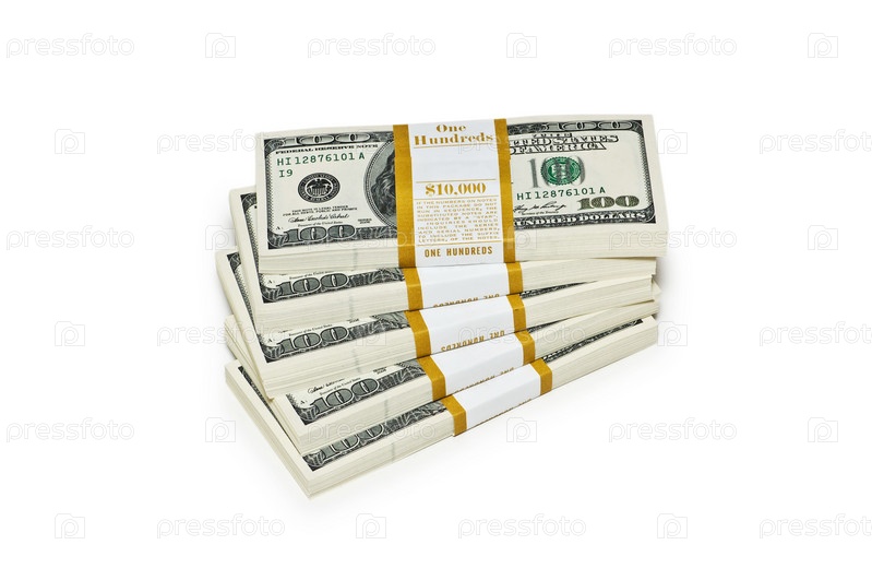 Пачки по 10 тысяч долларов на белом фоне