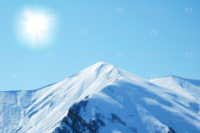 Снежные вершины гор на фоне голубого ясного неба