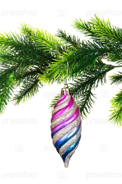 Новогодняя игрушка на ветке на белом фоне
