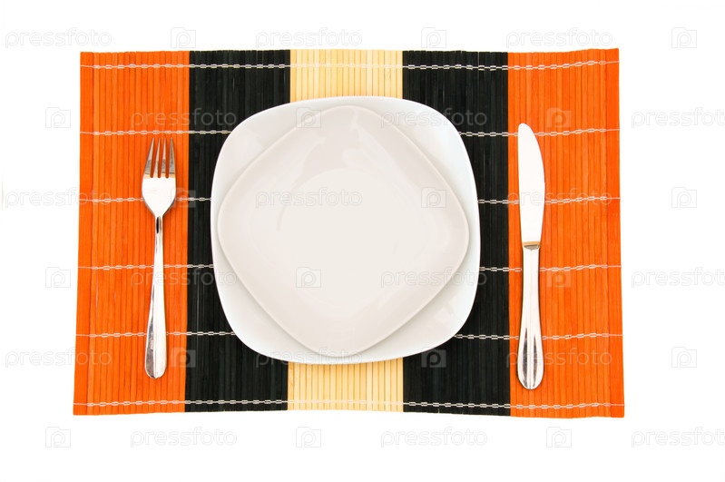 Чистая посуда на бамбуковой салфетке на белом фоне
