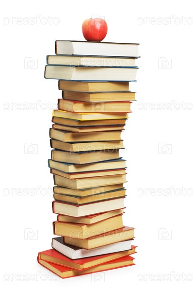 Красное яблоко на стопке книг на белом фоне