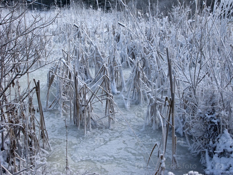 Заснеженный тростник в заледенелом пруду