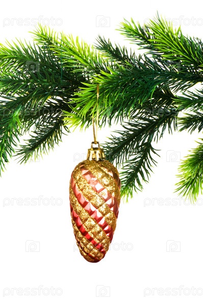 Новогодняя шишка на елке на белом фоне