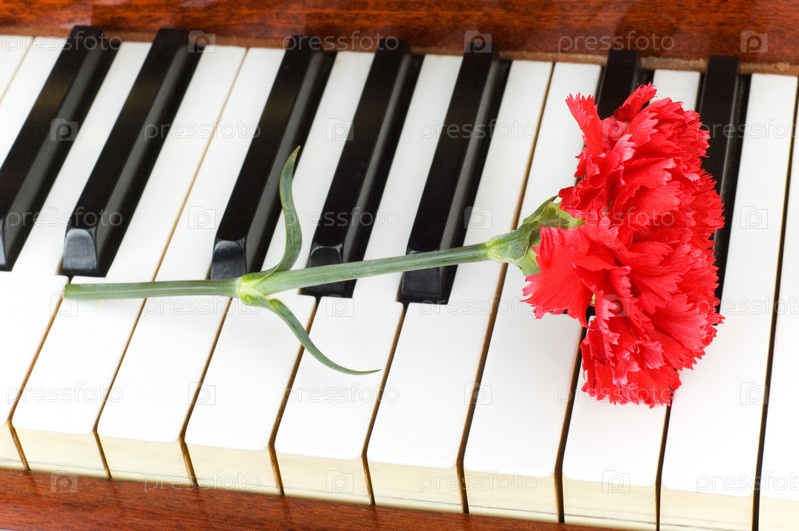 Красная гвоздика на клавишах пианино крупным планом